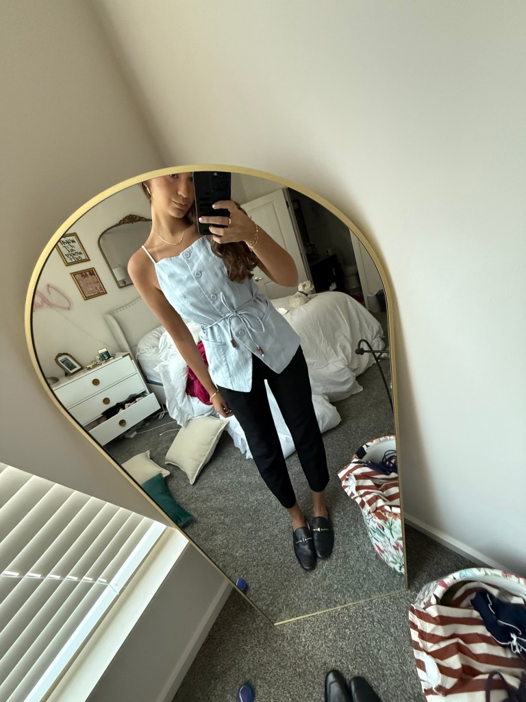 Button Tank Top, Work Slacks, and Loafers