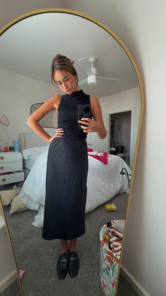 Silk Black Maxi Skirt, Black Mock Neck, Loafers