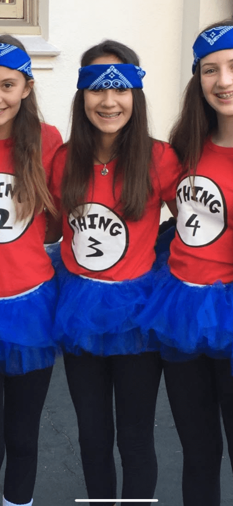 In 2016, the “it” costume was Thing 1, Thing 2, Thing 3, and so on. My three friends and I fell victim to the epidemic and decided we were going to be Things 1–4. We also wanted to wear leggings, which at our school was basically a sin, so we paired them with tutus to get away with it. The look: black Lululemon leggings, blue tutus, red “Thing” shirts, and blue bandanas.