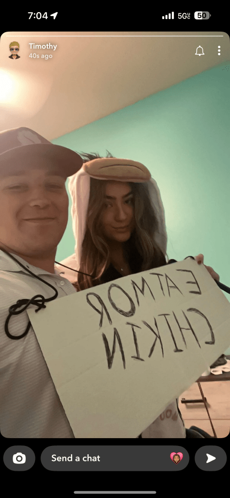 Finally, we stumbled upon a cow onesie. It was 80 degrees and humid, but we had no choice. Tim paired it with a Chick-fil-A worker costume, and suddenly, we were a couple’s costume: eat mor chikin.